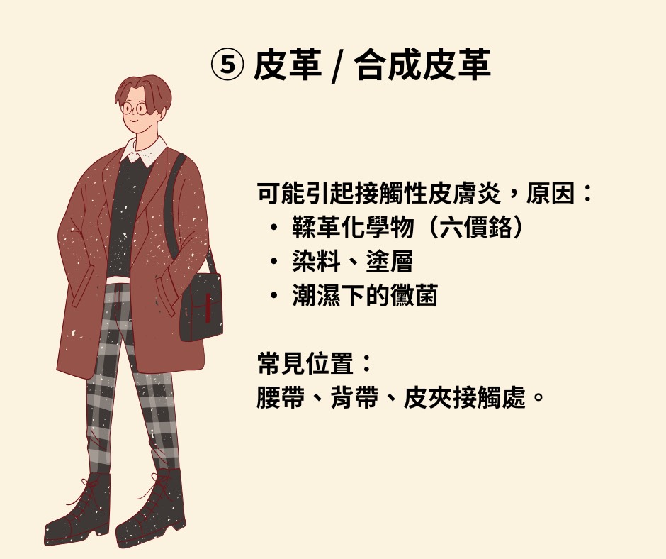 衣物材質+化學加工物質 引發的刺激性或接觸性皮膚炎。